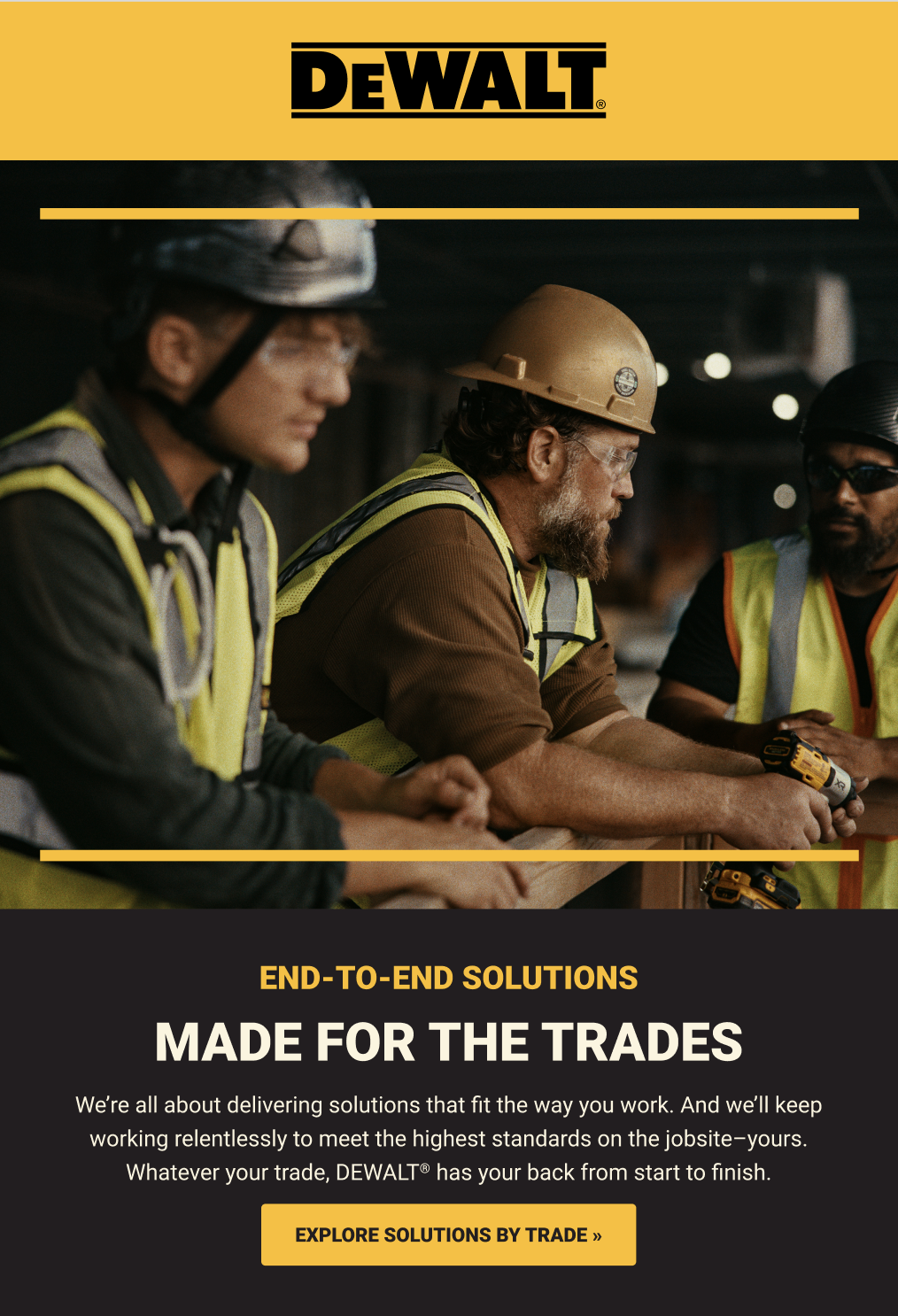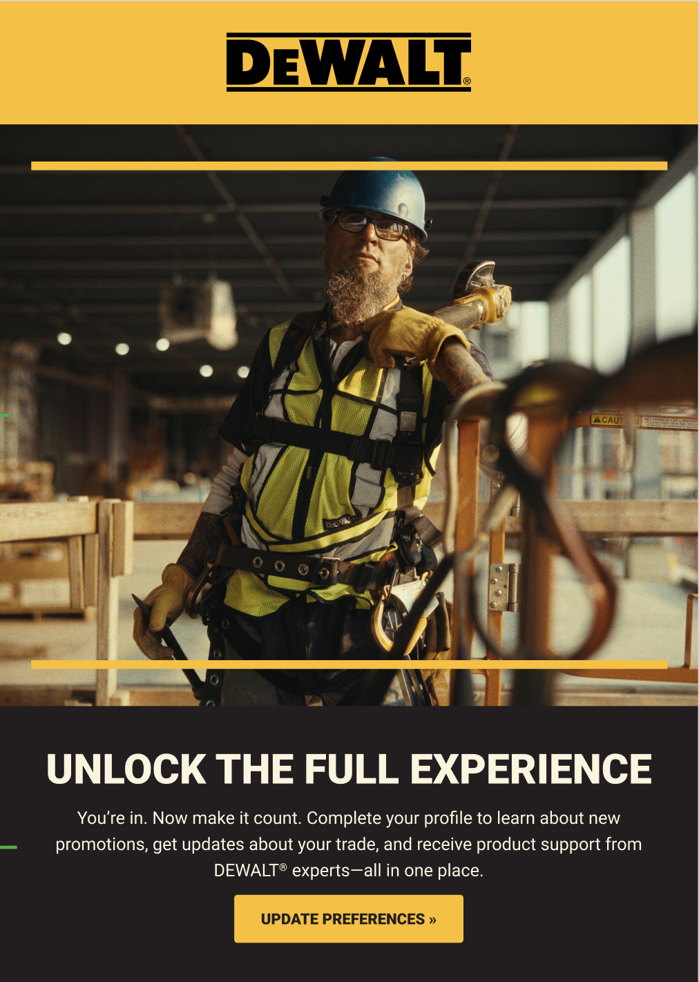 Email 2a, general variation. Sent to customers who didn't set preferences in Email 1. Takes a broader approach by showcasing DEWALT across multiple trades and project types since we don't yet know their specific interests. Includes a gentle reminder to complete their profile for more personalized content.