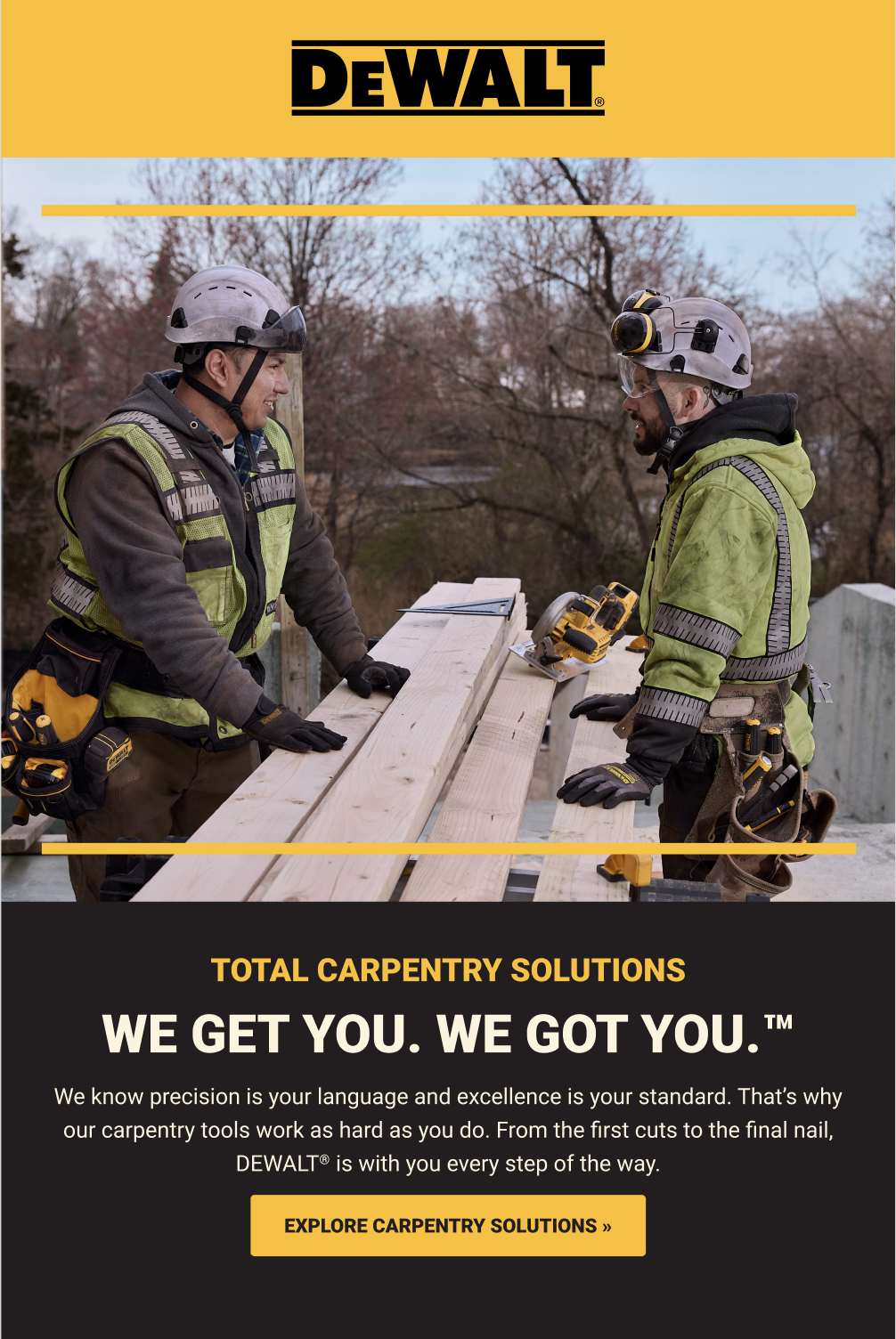 Email 2b, carpentry. Sent to customers who indicated an interest in carpentry. The other variations of email 2 deliver tailored content based on trade or area of interest (carpenters get different recommendations than electricians, concrete pros get different recommendations than plumbing pros, etc).