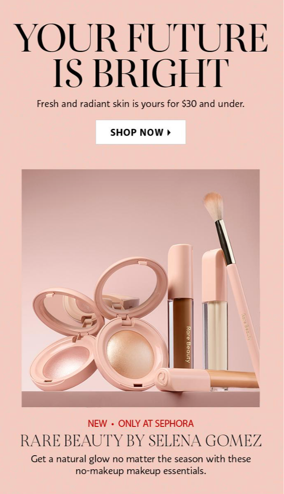 I developed messaging across email, push, and SMS that stayed true to Rare Beauty’s positioning around beauty as self-care, while aligning with Sephora’s digitally native voice. The goal was to cut through launch fatigue with clarity, cultural fluency, and a tone that felt grounded rather than performative.